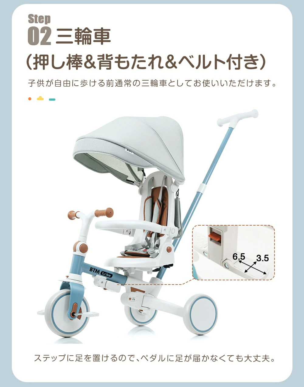 従来の5in1三輪車では対応可能な年齢や用途に制限があることも多いですが、BTM三輪車7in1は6か月から6歳までの長期間にわたり対応可能です。